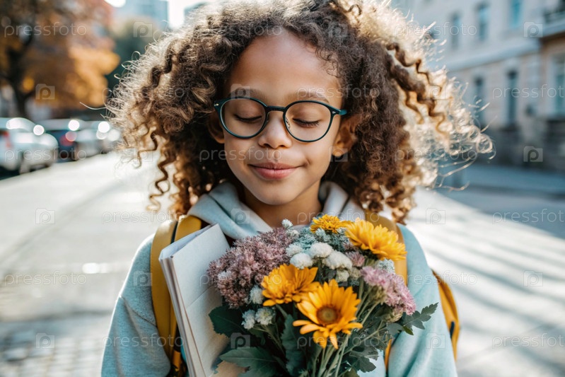 Красивая маленькая кудрявая девочка в очках и букете осенних цветов ходит в школу впервые. Ребенок со школьной сумкой, книгой и цветами. Малыш на городской улице. Возвращение к школе