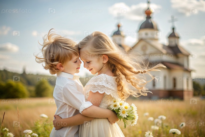 Всероссийский день семьи, любви, верности. милый мальчик и девочка с букетом ромашек на фоне православной церкви. День святого Валентина Петра и Февронии. религия, христианство