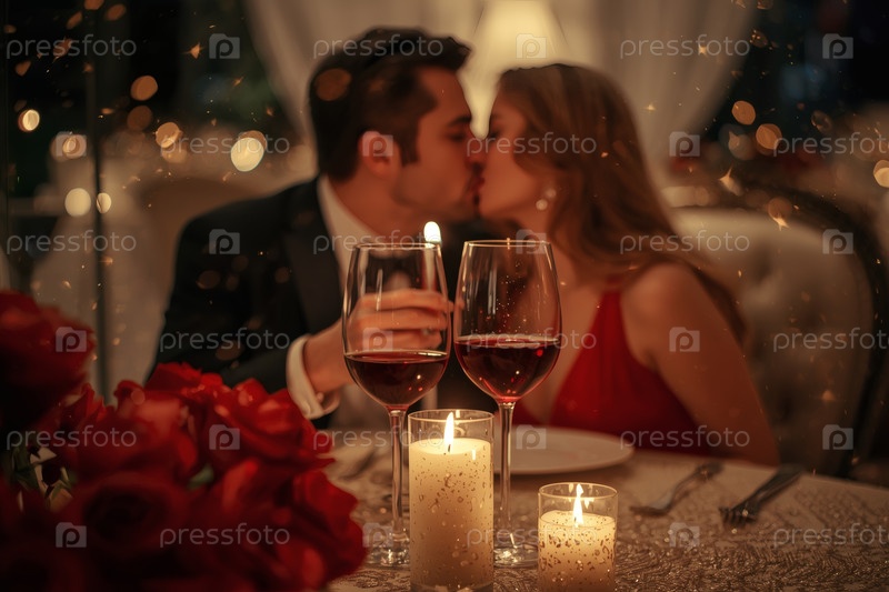 Концепция Дня святого Валентина: элегантная пара, целующаяся на романтическом ужине при свечах с бокалами вина в роскошный вечер