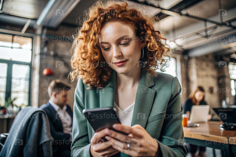 Деловая женщина с локонами красных волос и веснушками. Она одета в обычное зеленое пиджак. В руках смартфон. Небольшой бизнесмен смотрит на свой мобильный телефон