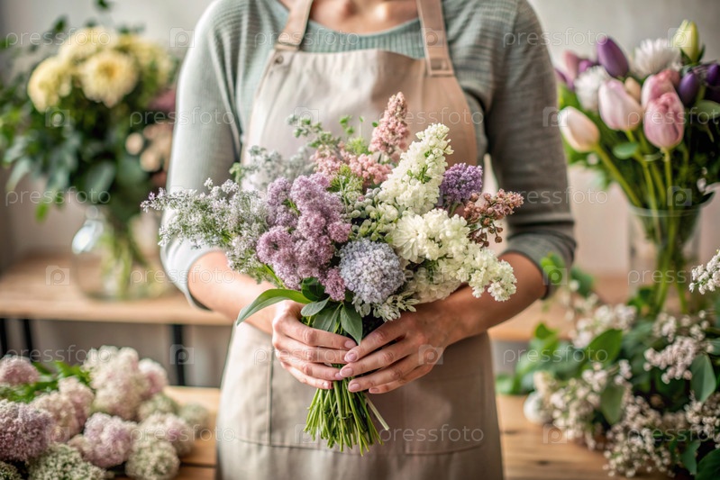 Малый бизнес. Декоратор-цветочник держит красивый деликатный букет цветов для покупателя. Цветочное оформление. Доставка цветов, обработка заказов