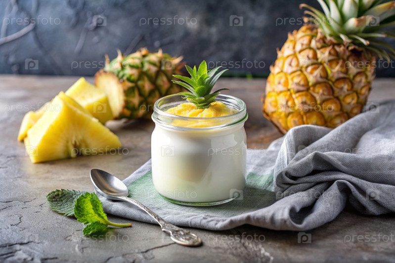 Домашний ананасовый йогурт со свежими ананами, винтажной ложкой и полотенцем на стильном сером фоне