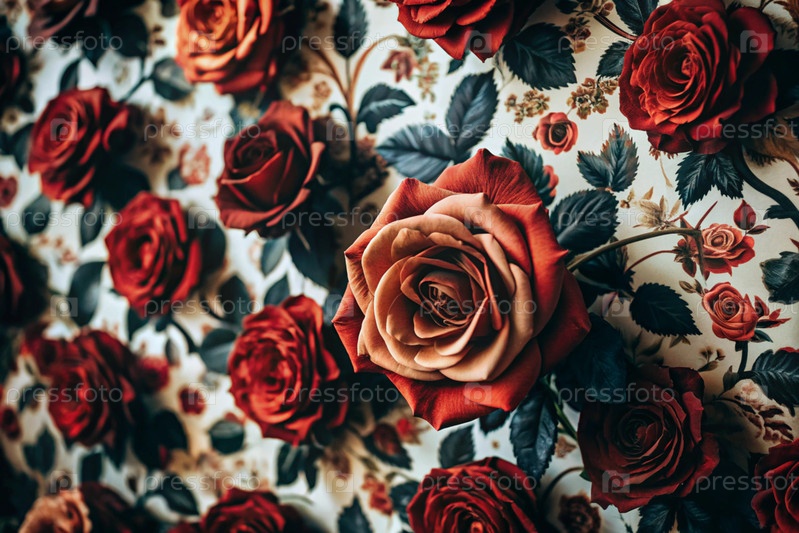 Фон с цветочным узором натуральных свежих красных роз. Вид сверху. Праздничный баннер