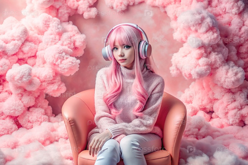 Молодая красивая японская девушка с розовыми волосами в аниме слушает музыку на беспроводных наушниках в розовых облаках