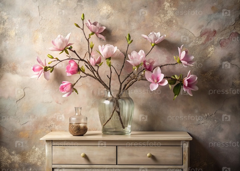 Красивая ветвь розовой магнолии в стеклянной вазе и флаконы на старом деревянном шкафу. Букет цветов в вазе в интерьере дома. Светлый, бежевый, розовый цветочный фон