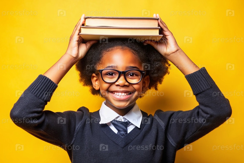 Красивая афроамериканская девушка с очками и книгами. Ребенок впервые ходит в школу. Ребёнок на желтом монохромном фоне