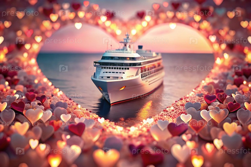 Любовный круиз. Ваше сердце и ваше сердце. Подарок для любимого человека в День святого Валентина - это как романтическое путешествие. Баннер с предложениями и акциями от туроператора