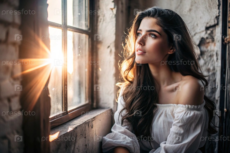 Портрет красивой девушки с кудрявыми волосами у окна старого дома, в котором светит теплое яркое солнце. Романтическое изображение. Одиночество, пустота и ожидание