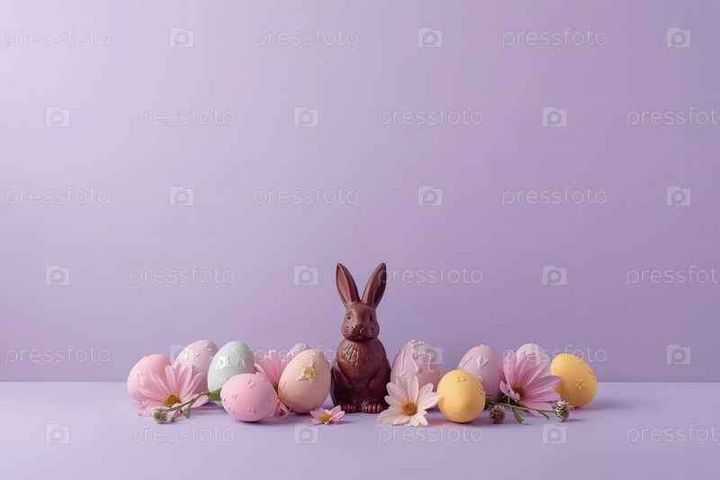 Счастливая Пасха 2026, минималистическое студийное фото. Шоколадный пасхальный кролик, пасхальные яйца и нежные весенние цветы. Мягкое освещение студии создает ощущение чистоты и воздушности