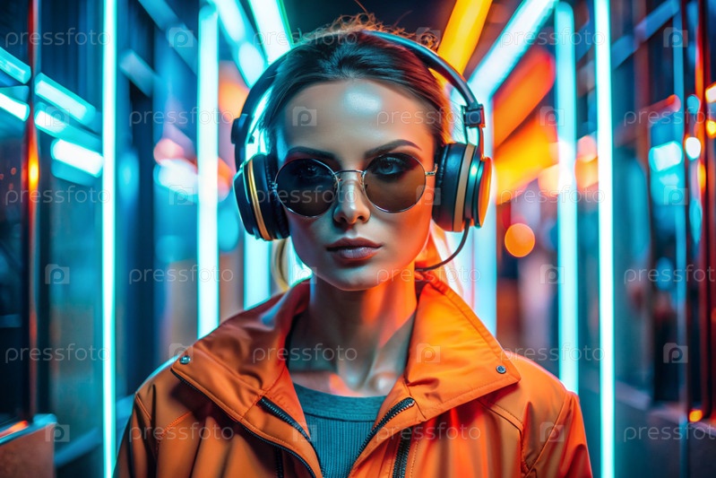 Молодая красивая девушка в солнцезащитных очках слушает музыку на больших беспроводных наушниках, стоя в неонном туннеле среди неоновых вывесок
