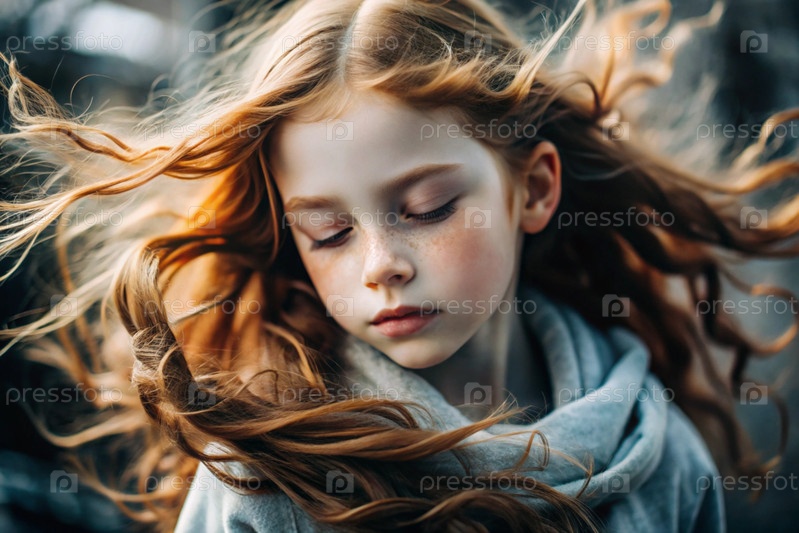 Портрет красивой маленькой рыжеволосой девочки с длинными волнистыми волосами и задумчивым взглядом.Власы развиваются и создают ощущение легкости и естественности