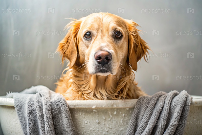 Золотой ретривер купается в пузырьковой ванне. Помыть собаку. Концепция ухода за домашними животными