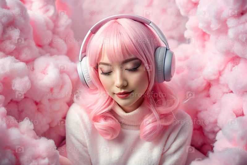 Молодая красивая японская девушка с розовыми волосами в аниме слушает музыку на беспроводных наушниках в розовых облаках