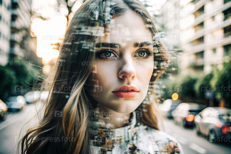 Портрет молодой женщины.Концептуальное искусство Клубовое изображение на фоне города с двойной экспозицией и визуальными эффектами
