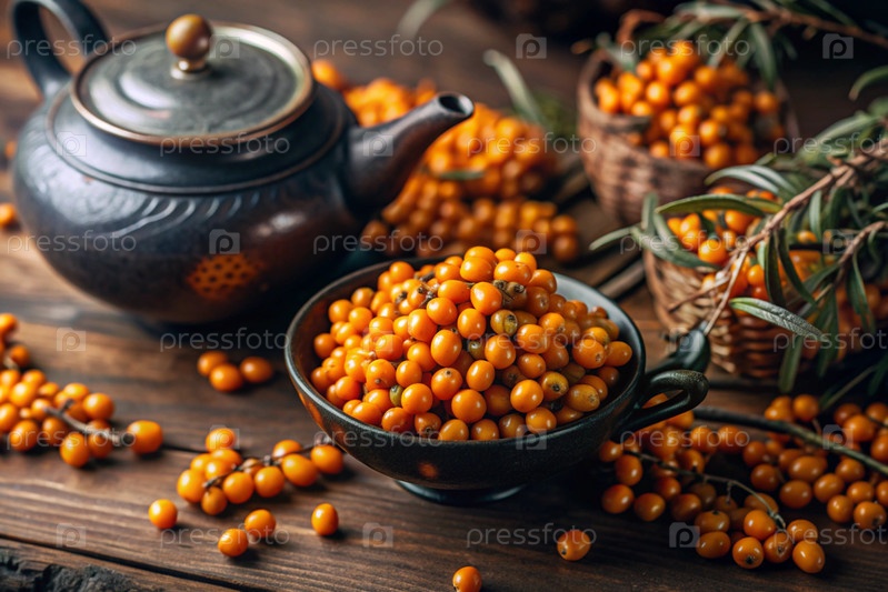 Здоровая, спелая ягода морского гречневого терна в ближайшем плане.Витамин, оранжевый, осенний, сезонный чай из ягод морского гречневого терна на темном фоне.Яблочный чай для иммунной системы
