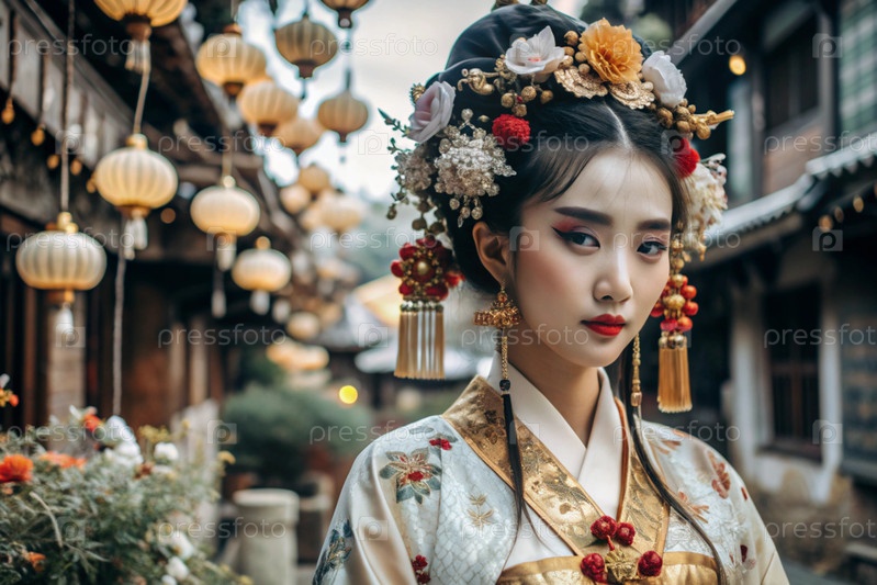 Японская девушка в традиционном национальном костюме - кимоно. На фоне домов, фонарей и вишневых деревьев портрет символизирует традиции и культуру народа Японии