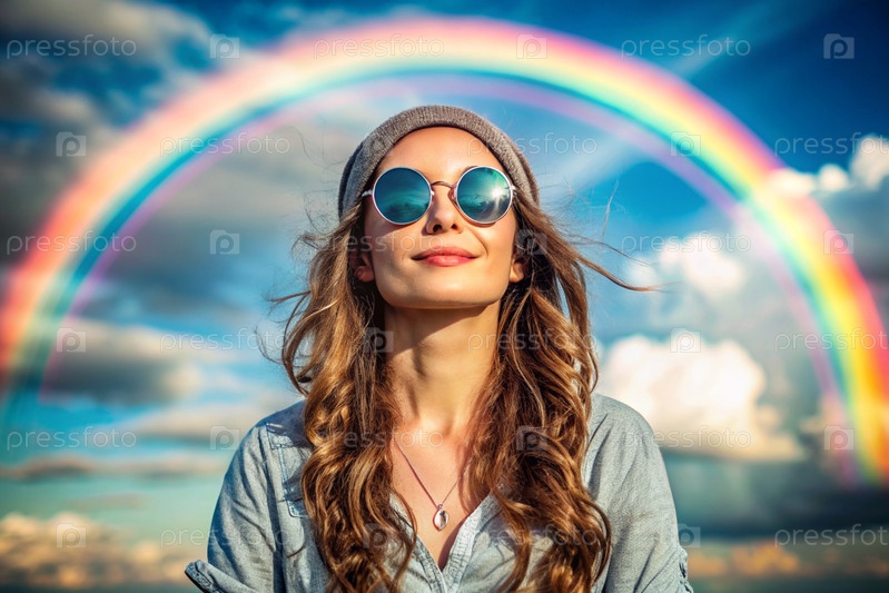 Счастливая женщина-хиппи в круглых солнцезащитных очках на фоне радуги.Девушка занимается медитацией и глубоким дыханием