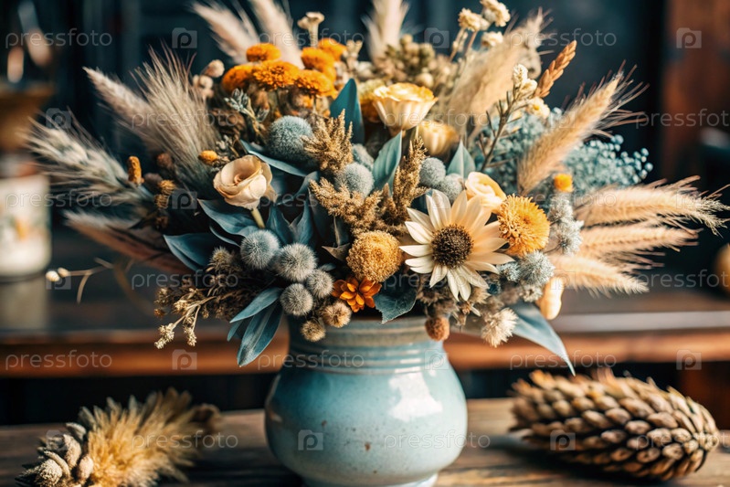 Красивый букет сушеных цветов в керамической вазе на древнем деревянном шкафу. Букет цветов в вазе во внутренней части дома. Светлый, бежевый, синий цветочный фон