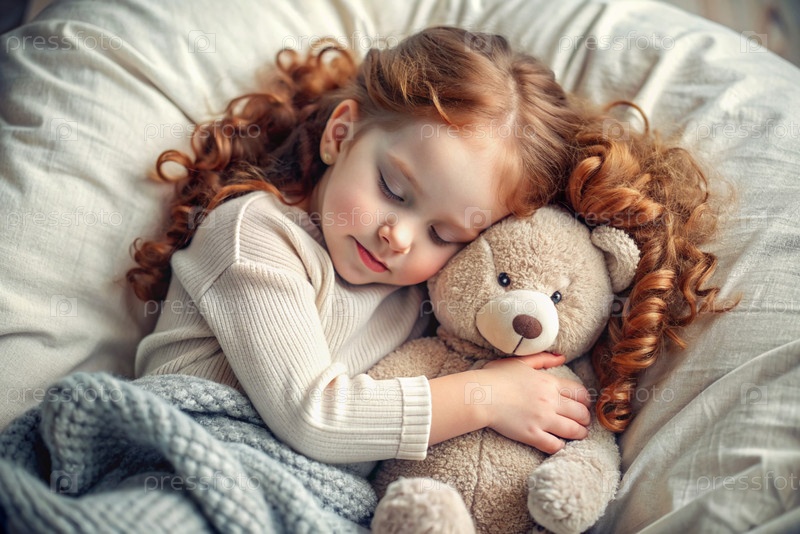 Маленькая девочка с длинными волосами и веснушками спит в своей кровати, обнимая плюшевого медведя