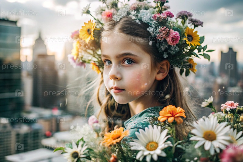 Портрет молодой девушки. концептуальный художественный крупнометражный снимок на фоне городского фона с двойной экспозицией и визуальными эффектами