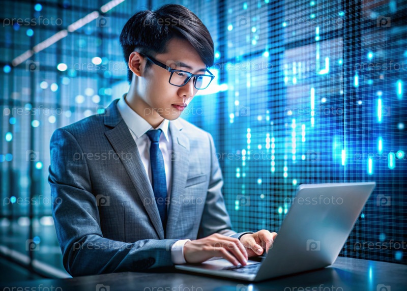 Молодой азиат в костюме работает в офисе за ноутбуком с цифровыми кодами на виртуальном экране Цифровые технологии будущего Разработка программного обеспечения