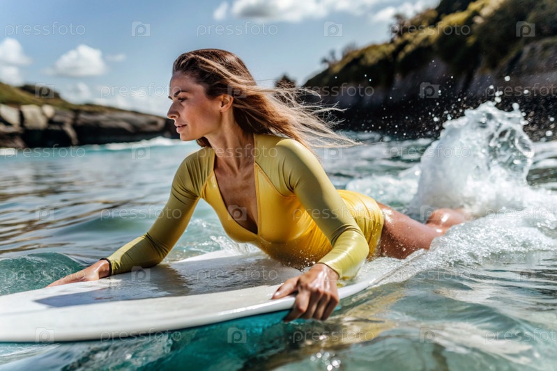 Женщина на доске для серфинга в купальнике в океане в солнечный день