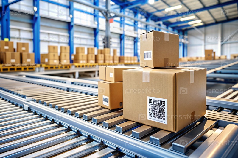 Интеллектуальная автоматическая упаковка посылок на складе, теги и QR-коды в картонные коробки для эффективного отслеживания, аутентификации и слежения