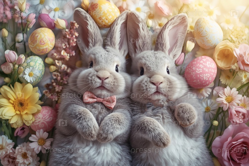 Пасхальные кролики лежат на пасхальных яйцах и смотрят в камеру