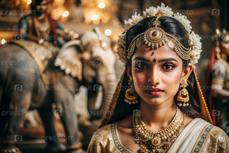 Красивая индийская девушка в традиционном национальном костюме, сари. со слонами. портрет символизирует традиции, культуру и красоту народа Индии