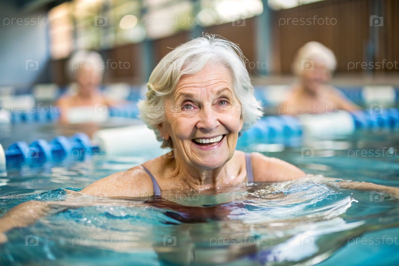 Пожилая женщина плавает и занимается водной аэробикой в отопительном бассейне, счастливый и улыбающийся пенсионер