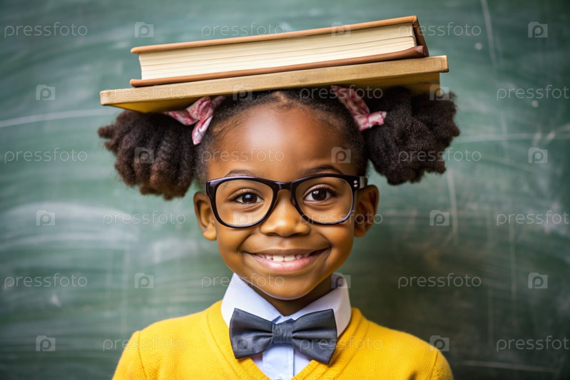 Красивая афроамериканская девушка с очками и книгами. Ребенок впервые ходит в школу. Ребёнок в классе с доской