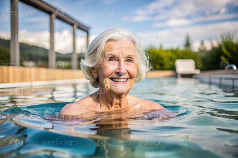 Пожилая женщина плавает и занимается водной аэробикой в отопительном бассейне, счастливый и улыбающийся пенсионер