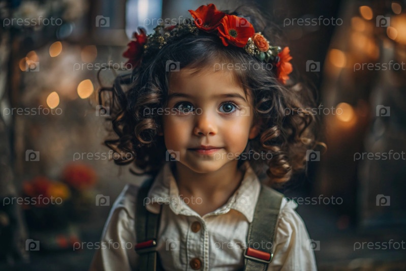 Портрет красивой маленькой кудрявой темнокожей девушки с цветочной тиарой или венком красных цветов на голове