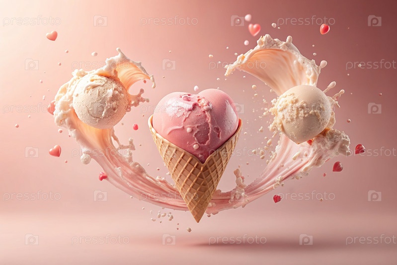 Сладкий десерт. Любовь к мороженому. Сердечно-образный конус мороженого с брызгами, сердцами и пятнами. Концепция Дня святого Валентина. Баннер, реклама