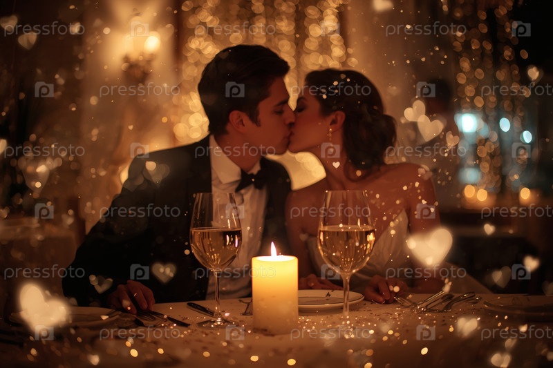 Концепция Дня святого Валентина: элегантная пара, целующаяся на романтическом ужине при свечах с бокалами вина в роскошный вечер