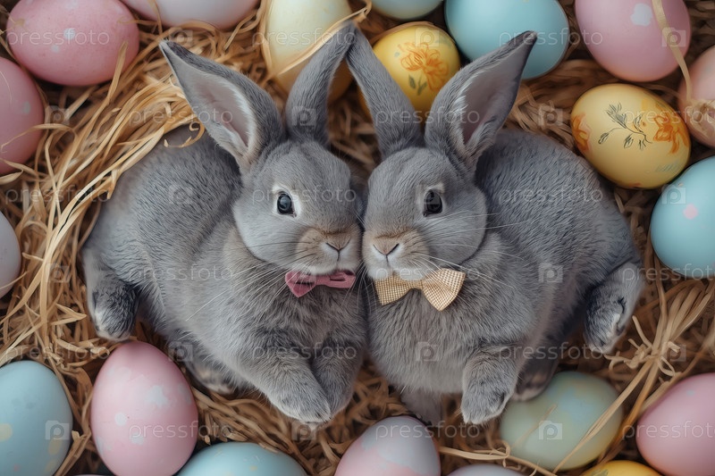 Пасхальные кролики лежат на пасхальных яйцах и смотрят в камеру