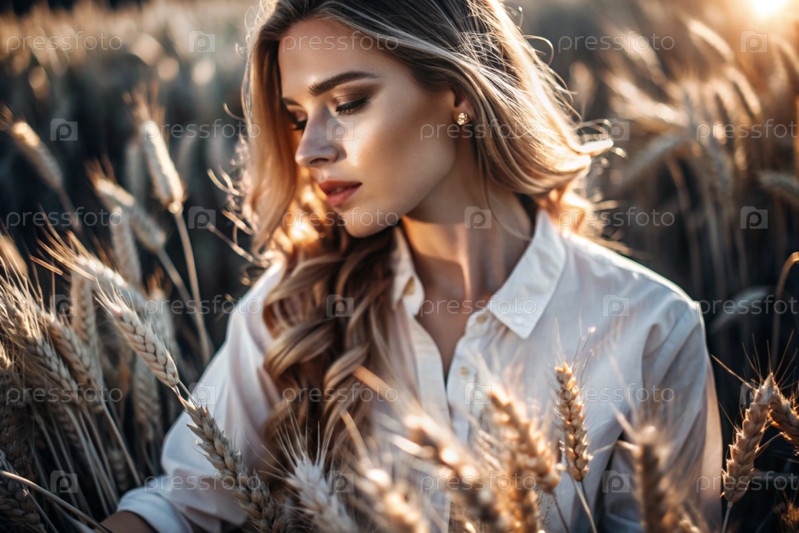Молодая девушка в белой рубашке с золотыми волосами стоит на поле спелой золотистой пшеницы при закате солнца.Урожай, сельская природа и жизнь