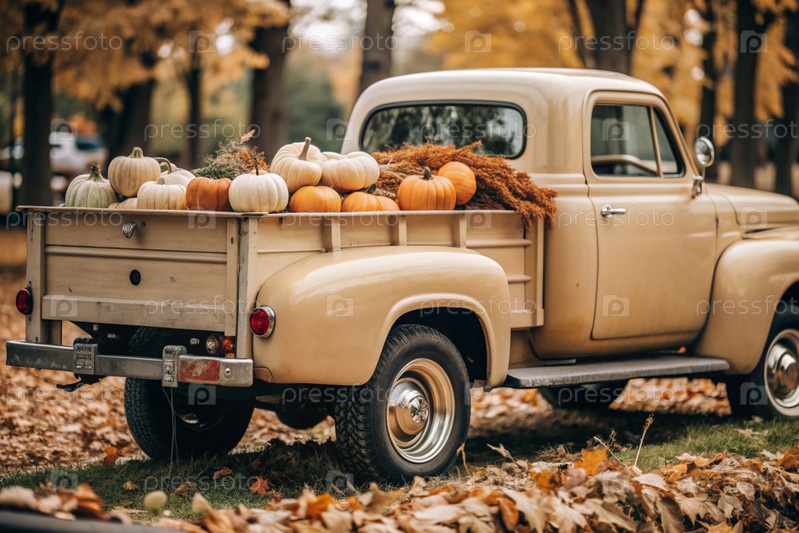 Осень, осенний дизайн.Большой урожай тыквы на заднем сиденье ретро-пикапа, крупный план