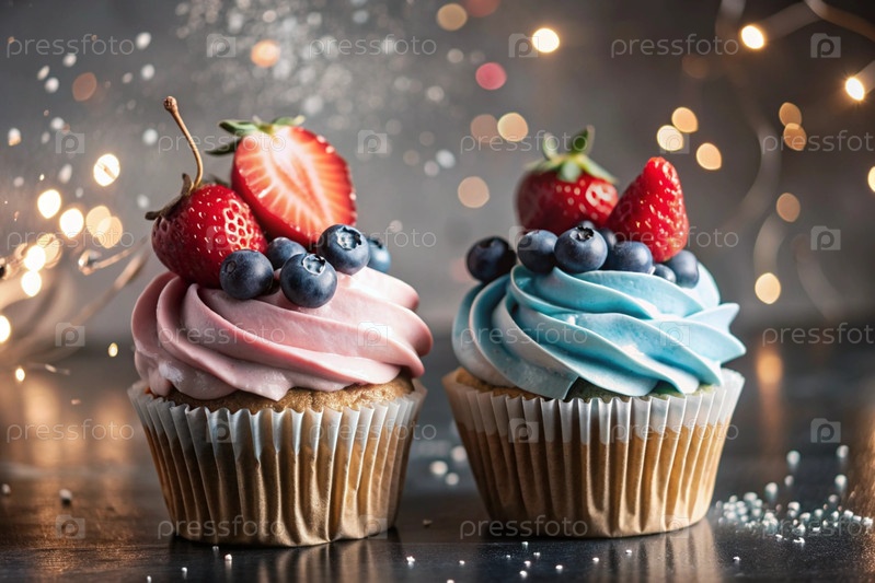 Вкусные красочные кексы со земляницами и чернилами. праздничный кекс, который идеально подходит для веселых торжеств. счастливого дня рождения