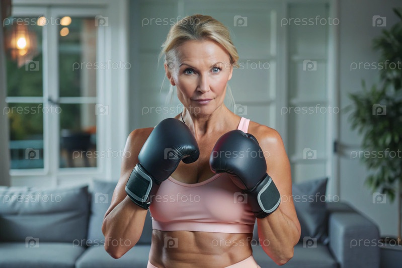 Портрет зрелой женщины: атлетичная, активная женщина средних лет в спортивной одежде и боксерских перчатках стоит на стенде и готовится к боксу дома
