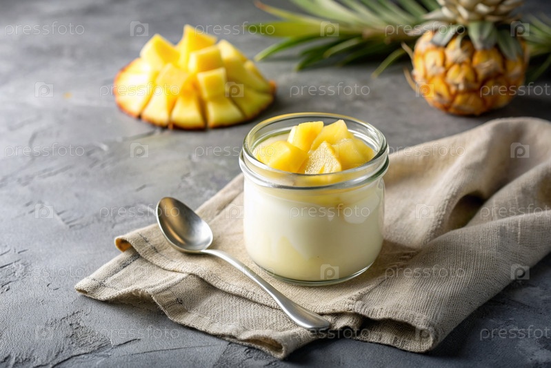 Домашний ананасовый йогурт со свежими ананами, винтажной ложкой и полотенцем на стильном сером фоне