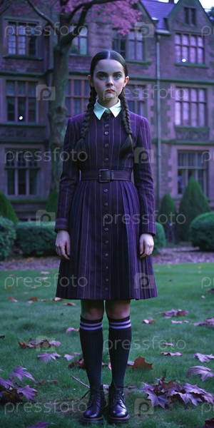 Девушка с хвостиками в черном платье с белым воротничком стоит перед большим поместьем