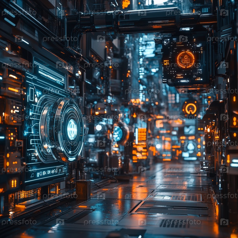 Футуристический город с сияющим цифровым интерфейсом