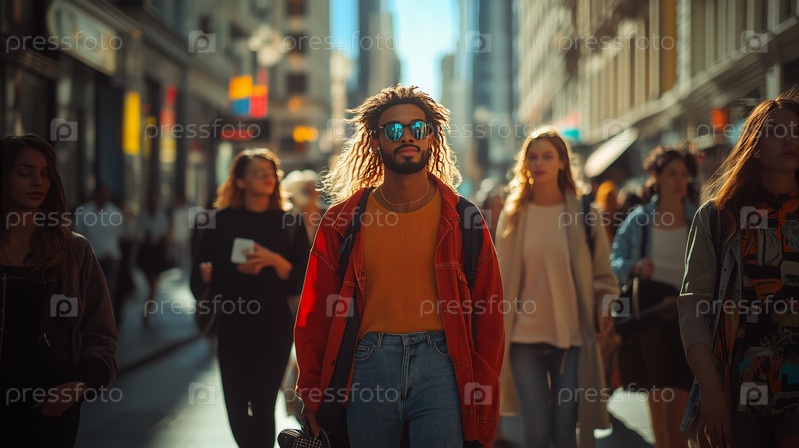 Уверенный в себе молодой человек идет по оживленной городской улице