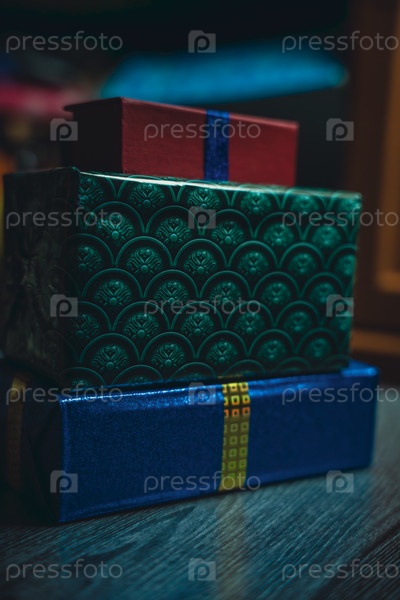 Коробки с подарками на деревянном столе