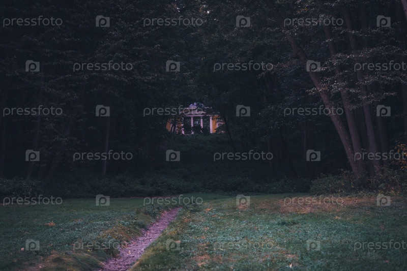 Желтая вилла, спрятанная в лесу во время сумерек