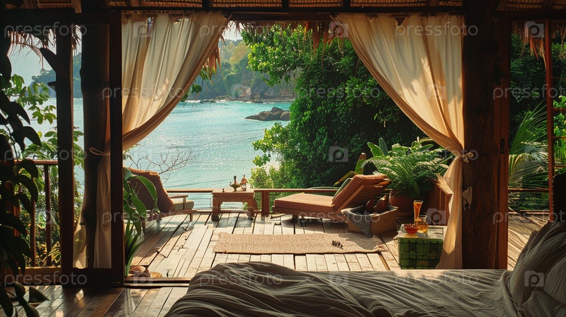 Красивая пляжная интерьерная сцена из роскошных номеров у моря.Отдых, отдых, природа