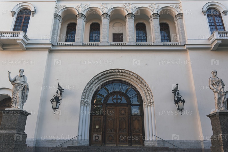 Украшенный вход со статуями и арочной дверью в историческом здании