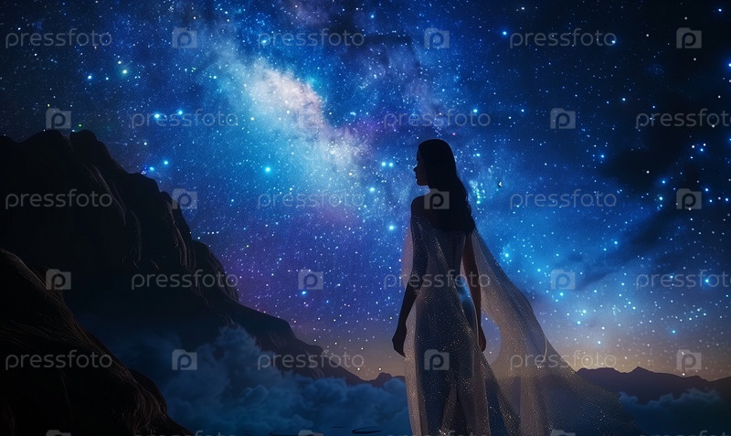 Красивая женщина в прозрачной одежде, стоящая на фоне космического неба