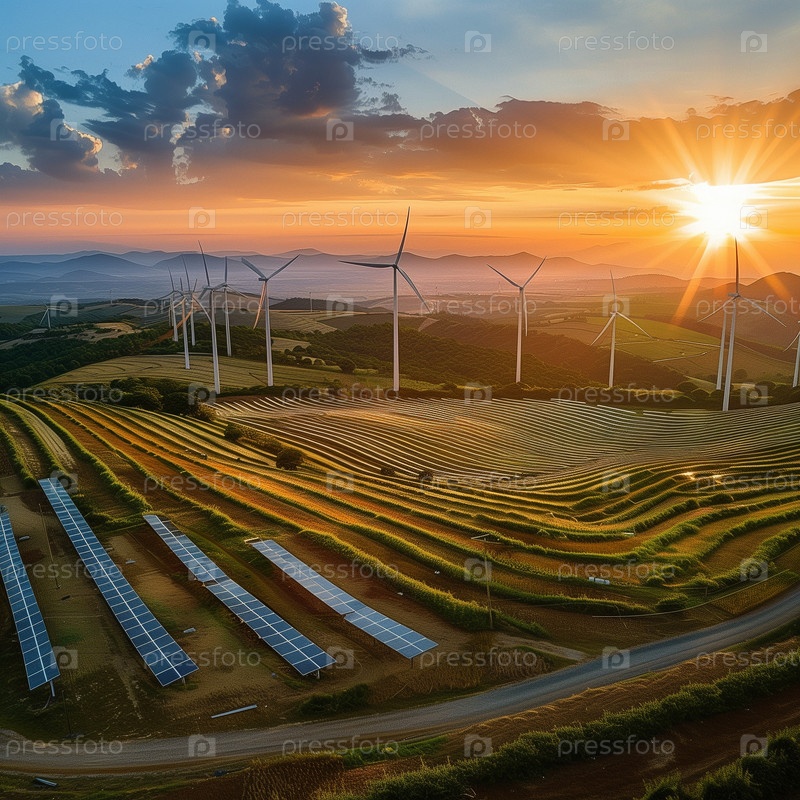 Город с солнечными батареями и ветряными мельницами.Инвестиции в устойчивые проекты и экологически чистые технологии.Профессиональный опыт